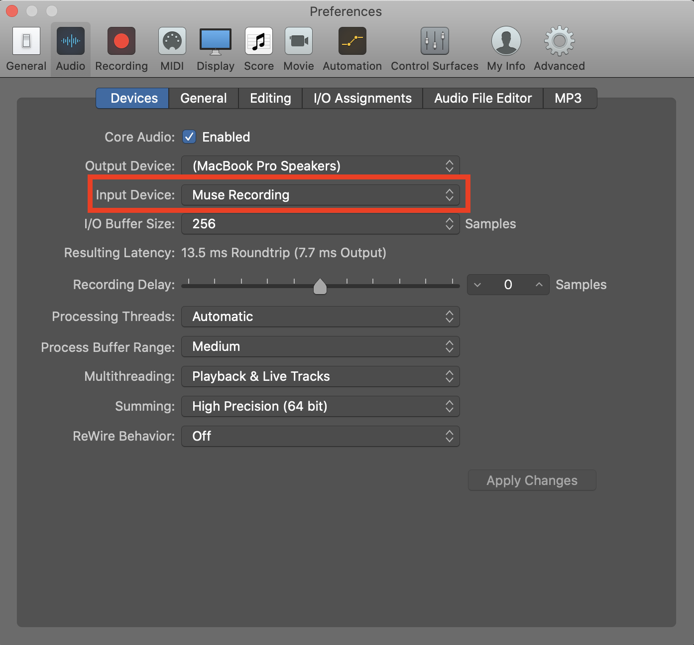 When simple recording is enabled, recorded audio from Muse will pass through the Muse Recording device which you can select as an input in your DAW. There is no additional setup but there will be a delay in the recording.