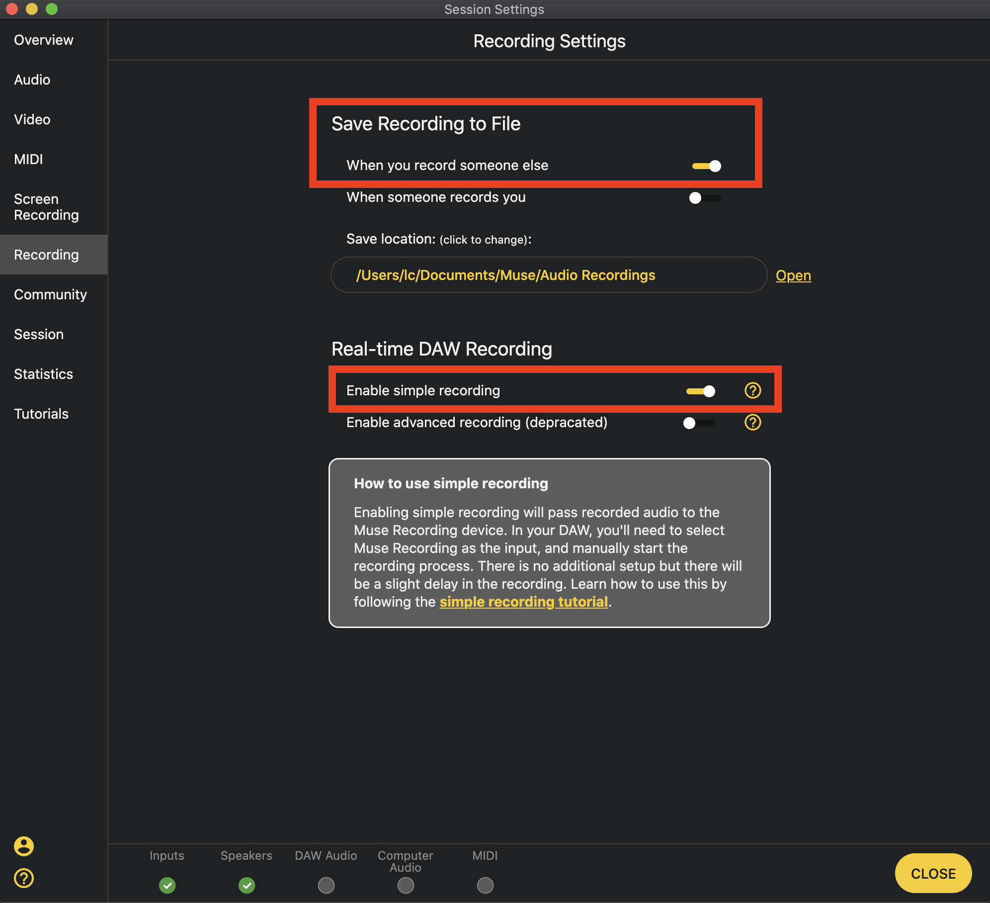 When simple recording is enabled, recorded audio from Muse will pass through the selected recording device which you can select as an input in your DAW. There is no additional setup but there will be a delay in the recording.